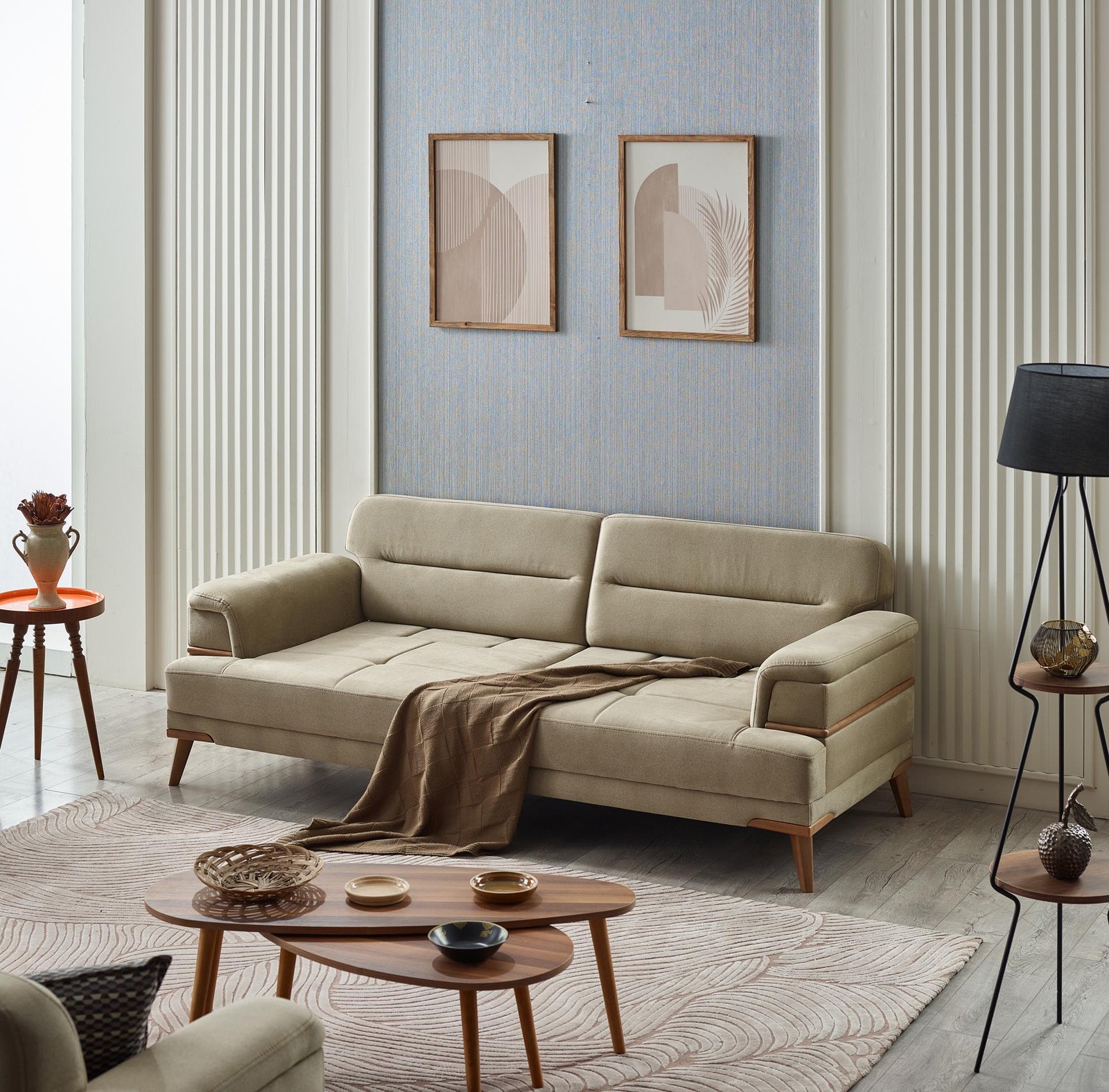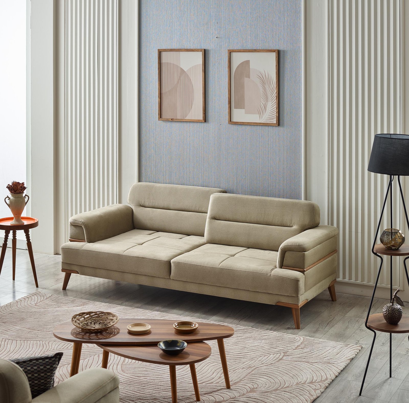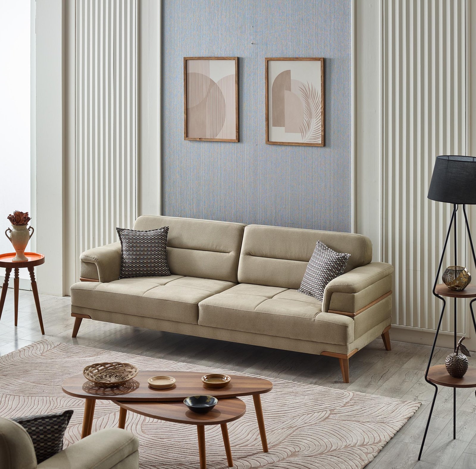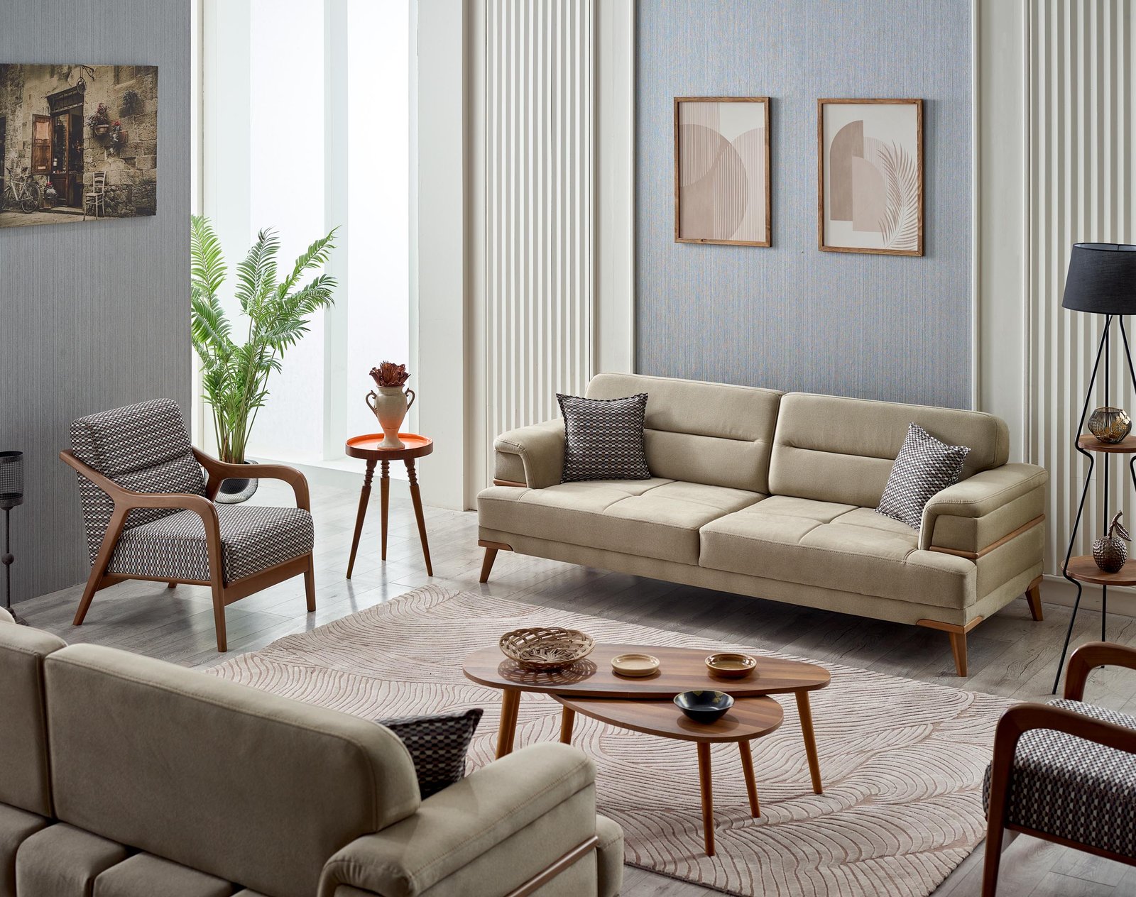 Modern İskandinav tasarımın zarafetini yansıtan Prada Koltuk Takımı, krem rengi premium kumaş döşemesi ve ahşap detaylarıyla yaşam alanınıza sofistike bir dokunuş katıyor.