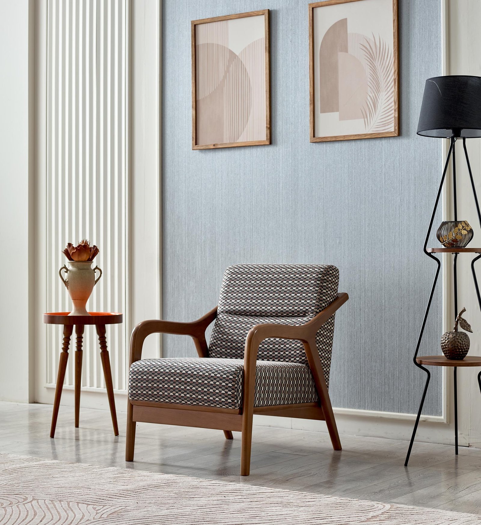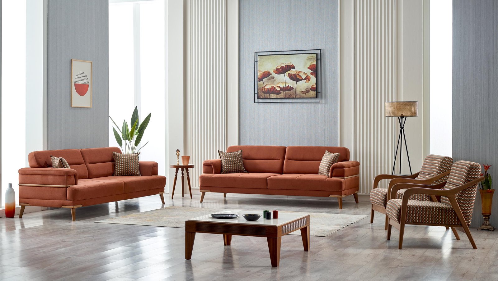 Minimalist ve şık tasarımı ile dikkat çeken Prada Koltuk Takımı, yüksek ayakları ve ince hatlarıyla mekanı olduğundan daha ferah gösteriyor. Geometrik desenli berjer koltuklarıyla modern bir görünüm sunarken, gri tonlarındaki duvar rengi ve ahşap aksesuarlarla mükemmel bir uyum yakalıyor. Özellikle iskandinav ve modern dekorasyon tarzları için biçilmiş kaftan olan bu takım, orta sehpa ve yan sehpalarla bütünlük oluşturuyor.